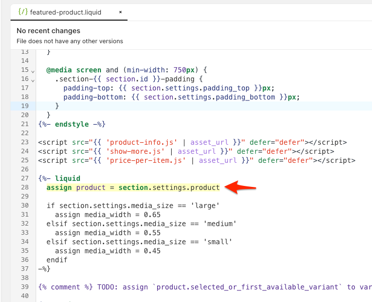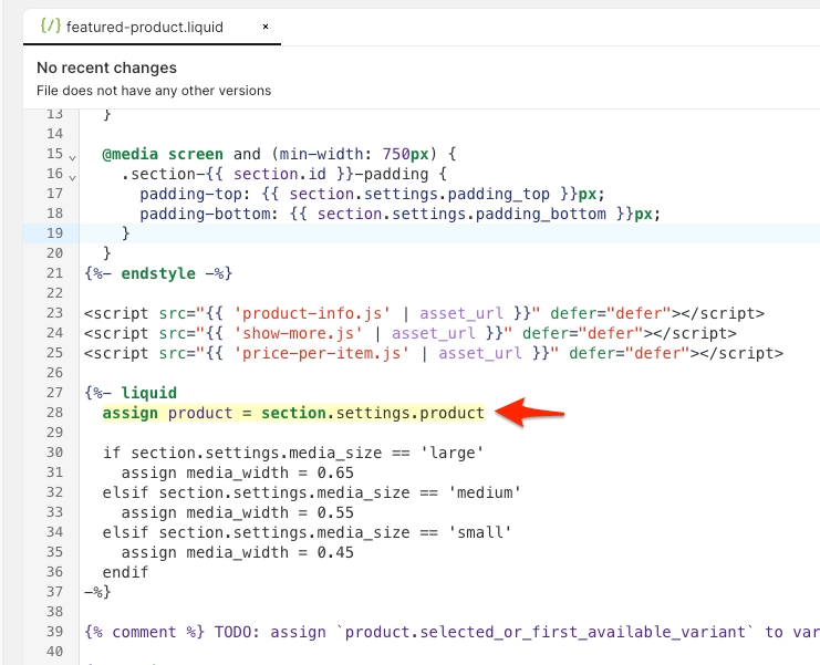 3. In the theme's files and under the Sections folder, navigate into the featured-product.liquid file.