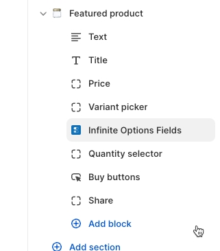5. In the Shopify Theme Customizer, add the Infinite Options app block on the featured product.